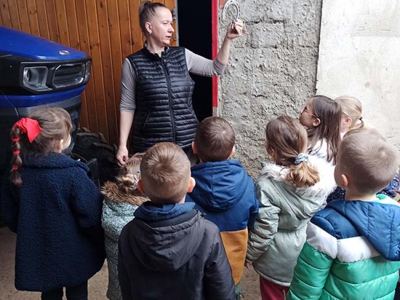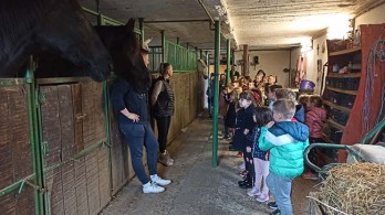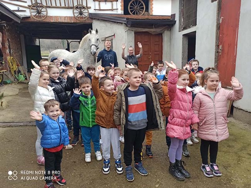 Dana 27.02.2024. skupina "Ribice" i skupina predškolaca, zajedno s odgojiteljicama Marija Krolo Tandarić i Martina Akmačić, uputili su se u posjetu obitelj Madžarević kako bi djeca vidjela konje i konjičku opremu. Posjeta je organizirana u sklopu ovotjednih aktivnosti na temu domaćih životinja. Na obiteljskom imanju dočekali su ih Marija Madžarević i njezin sin Matija Madžarević koji su u štali pokazali konje dviju pasmina, Noniusi crni čija imena su Mitoz i Baro te lipicansku pasminu konja imena Batosta, Siglavy, Elza. Djeca su konje hranila mrkvama i jabukama, milovali ih te se fotografirali. Također, domaćini su djeci pokazali konjičku opremu (fijakere, sedla, potkovu...). Nakon razgovora i razgledavanja djeci su u uređenom prostoru etno stila, poslužene grickalice i sokovi. Djeca su u znak zahvalnosti otpjevali pjesmicu "Điha, điha konjo", a gostoljubljivi domaćini ih pozvali da opet dođu u posjetu te da će imati priliku gledati jahanje kroz Rešetare koje će se održati u travnju.