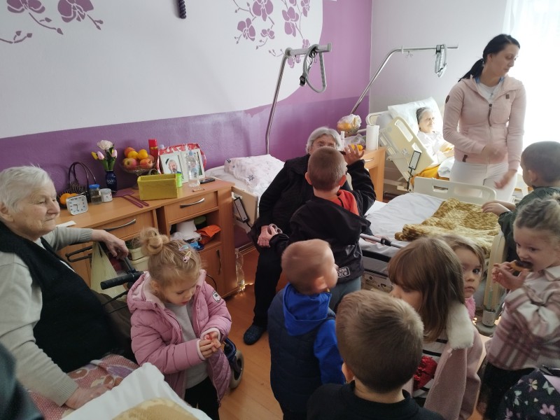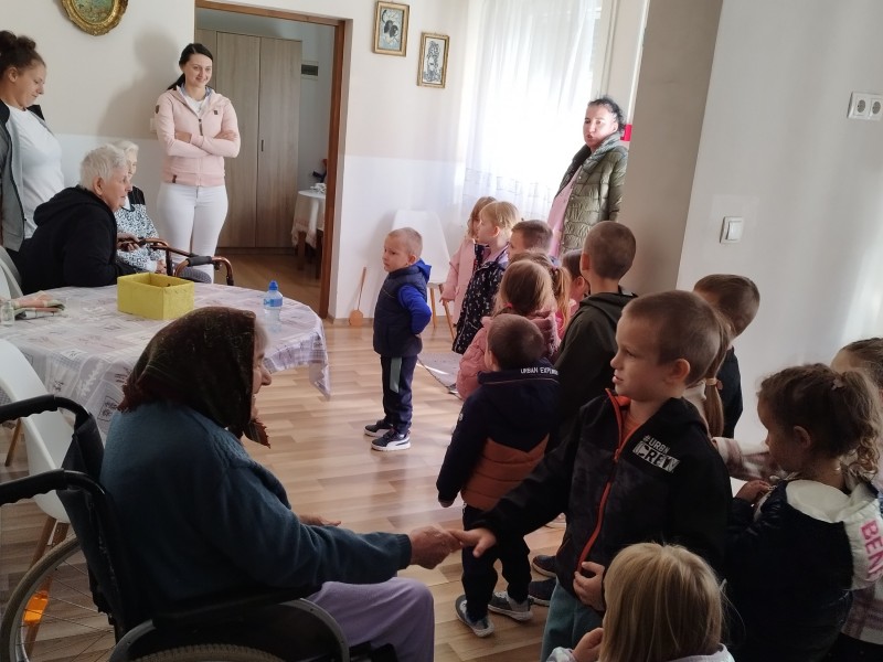 Djeca starijih mješovitih skupina, Ribice i Žabice, posjetila su 1. listopada 2024. godine sa svojim odgojiteljicama, obiteljski dom za starije Ivan Jug u sklopu obilježavanja Međunarodnog dana starijih osoba. Uz ugodno druženje djece i starijih, pjevanja raznih pjesmica i razgovor, uručili smo djedovima i bakama voće, slatkiše i srceta koja su izradila djeca. Jedna starija baka izrecitirala je i otpjevala staru pjesmicu iz njezinog djetinjstva. Cilj obilježavanja i posjete doma za starije je poticati kod djece razvoj osjećaja pažnje i brige za starije i nemoćne tj. za sve osobe kojima je potrebna naša pomoć. Zahvaljujemo se gospođi Nadi Jug i djelatnicima doma na dočeku, strpljenju i ugodnom okruženju te slatkišima kojima su obradovali djecu.