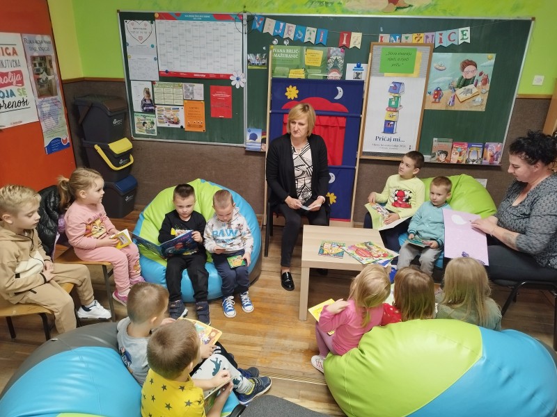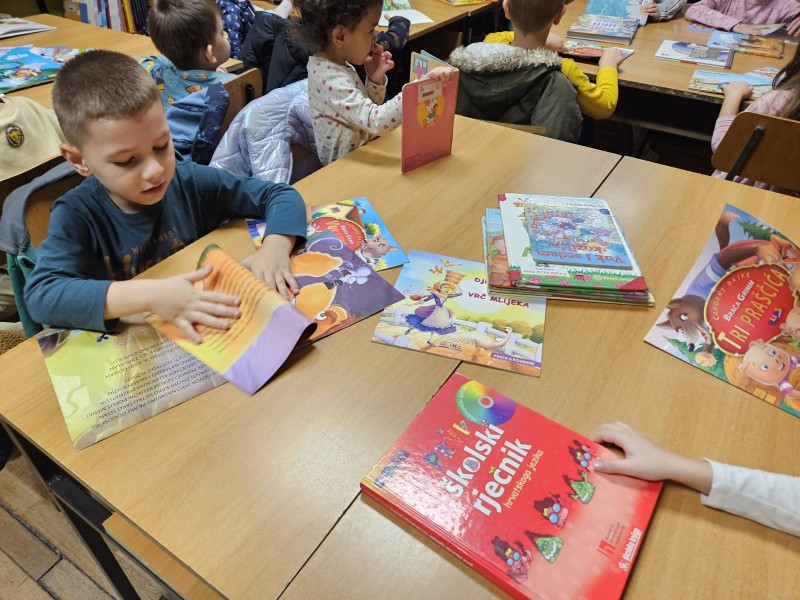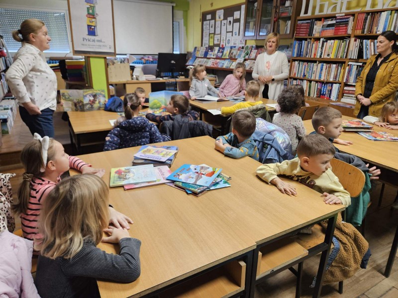 Povodom Mjeseca hrvatske knjige, skupine Žabice i Ribice posjetile su školsku knjižnicu OŠ Ante Starčević u Rešetarima. Ugodno su nas dočekali i primili knjižničarka Gubić te pedagoginja Dautović. Djeca su prošetala knjižnicom kako bi se upoznali sa sadržajem raznih knjiga: slikovnicama, knjigama za stariju djecu, romanima, enciklopedijama i sl. Iste su djeca mogla po želji prelistati a jednu po izboru smo i pročitali. Djeca su se pohvalila knjigama koje oni imaju kod kuće, čitaju li sami ili im roditelji čitaju prije spavanja, posjećuju li knjižnicu i koje su im knjige najdraže. Posjetio nas je i ravnatelj Batalo kako bi nas pozdravio te se upoznao s budućim prvašićima. Na kraju nam je knjižničarka pustila kratki video Željke Horvat-Vukelja, hrvatske književnice za djecu. Prilikom odlaska, knjižničarka i pedagogica su nam pokazali učionicu u koju će učenici dolaziti na nastavu kada još malo narastu.